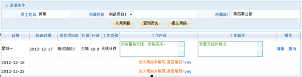 日报/周报的管理按照不同项目组的操作权限赋予项目组成员,项目组成员按照要求填写自己的项目工作日志,以及自身工作任务的执行情况。项目经理可以看到所有自己负责项目的日报/周报。