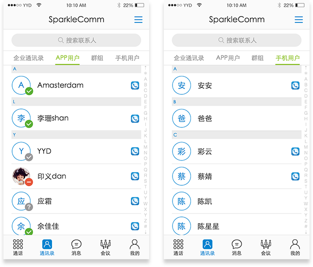 通讯录--SparklePhoneBook网络电话解决方案整合通讯录功能,包括企业通讯录、云端通讯录、手机通讯录同步、好友管理等通讯录功能。 特征:1.支持读取本地通讯录(iOS/Android/macOS);2.支持私有云端通讯录;3.企业通讯录具备后台web管理功能;4.支持多级组织架构;5.支持分级权限控制。 |